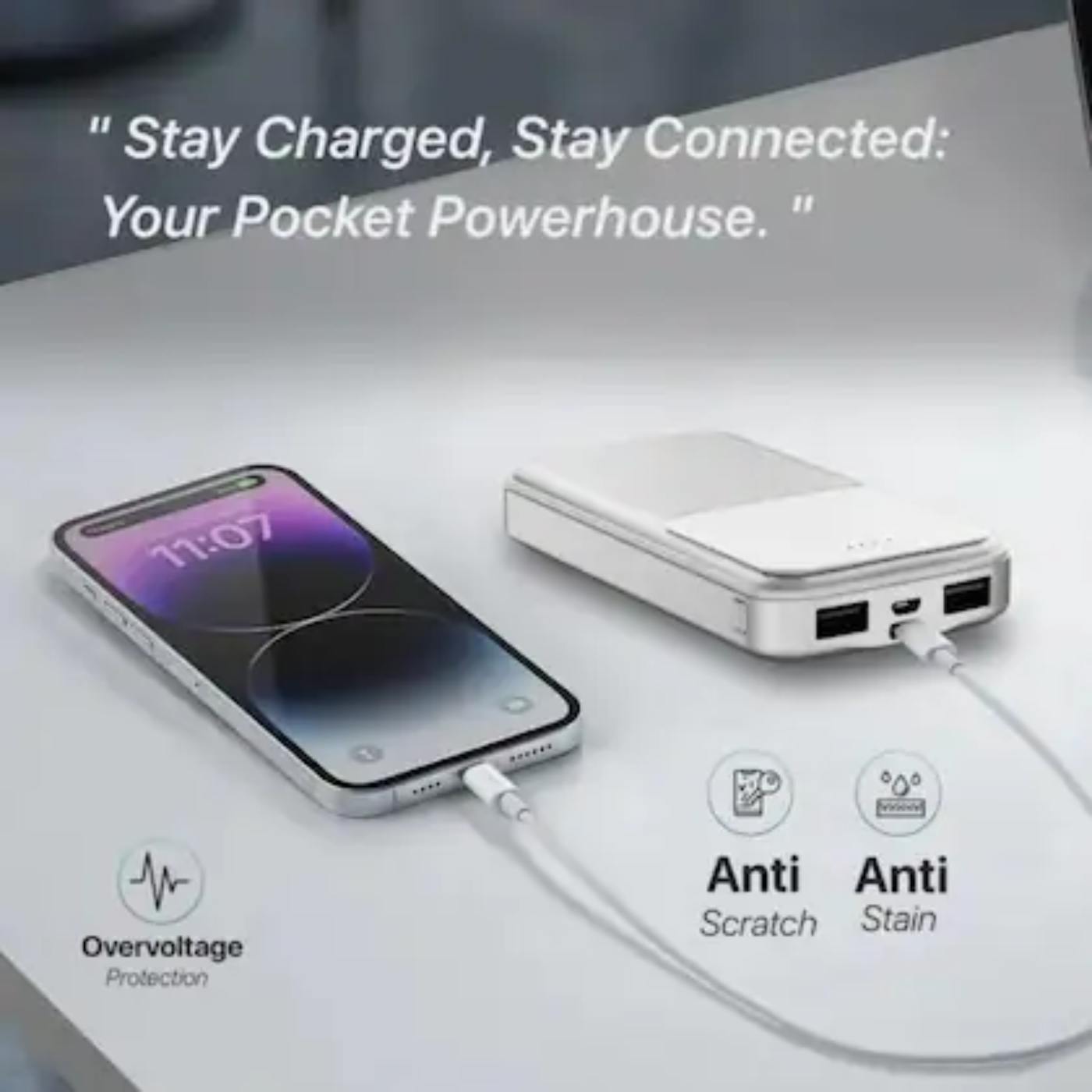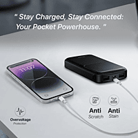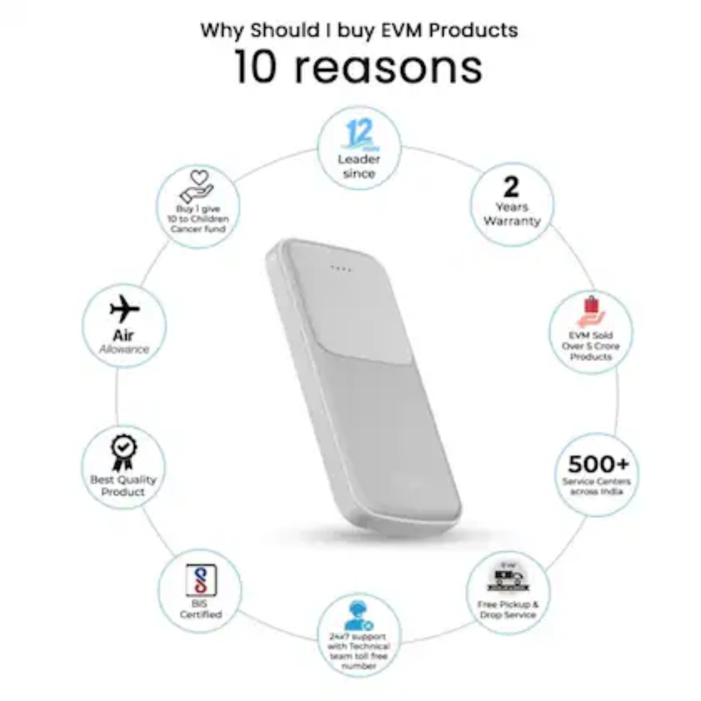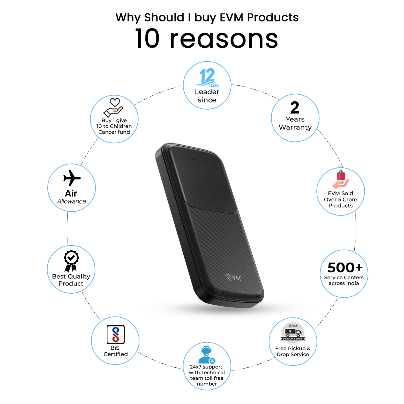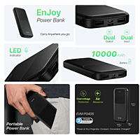Stay powered up and connected wherever you go with the EVM EnJoy P0405 10000mAh Power Bank. Engineered for convenience and reliability, this portable external battery pack ensures that your devices never run out of juice. With a robust Li-polymer battery and versatile charging options including Micro and Type-C inputs, along with two USB outputs delivering up to 12Watt (Max) of power each, this power bank is compatible with a wide range of devices including smartphones, tablets, and more. The LED indicator lights allow you to easily monitor the remaining battery capacity, while built-in over voltage protection ensures the safety of your devices during charging. Sleek, compact, and backed by a 2 Years Warranty, the EVM P0405 Power Bank is your perfect companion for travel, outdoor adventures, and everyday use.